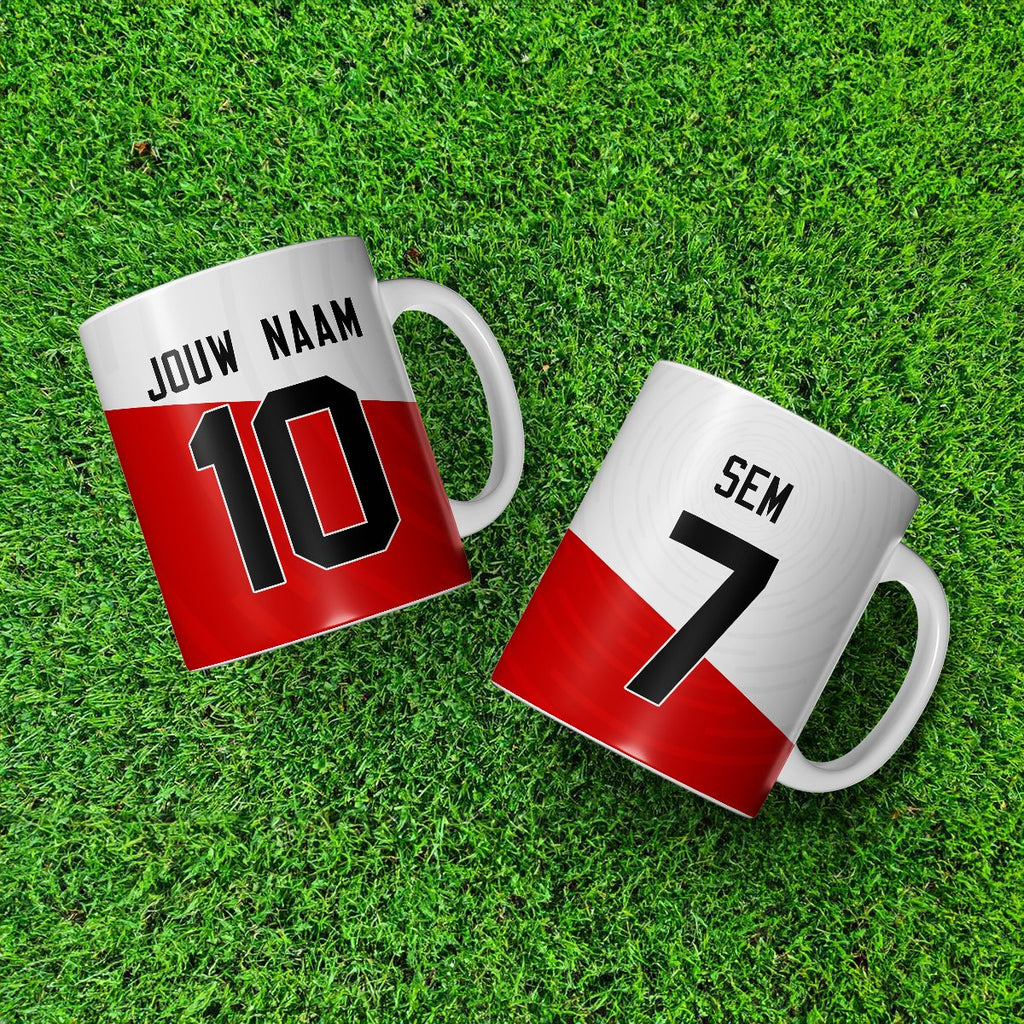 De personalisatieoptie stelt je in staat om de mok te voorzien van de naam en het rugnummer van jouw keuze, waardoor het een ideaal item is voor elke supporter of een bijzonder cadeau.