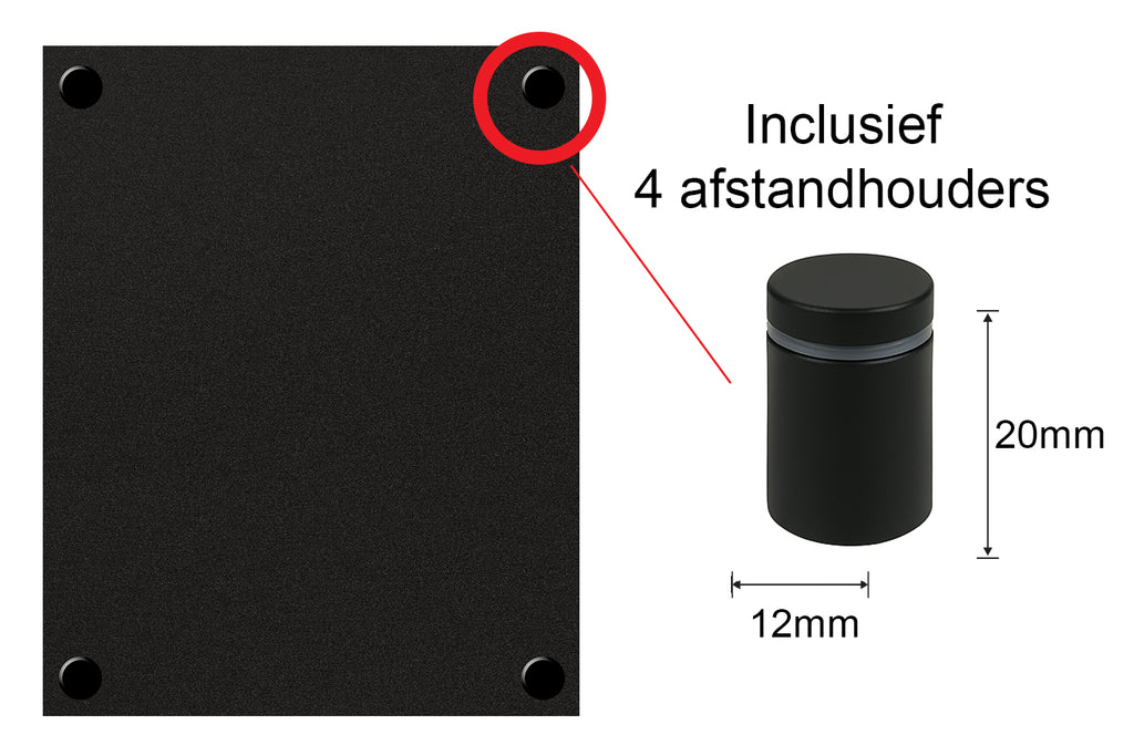 Inclusief 4 zwarte afstandhouders, schroeven en pluggen