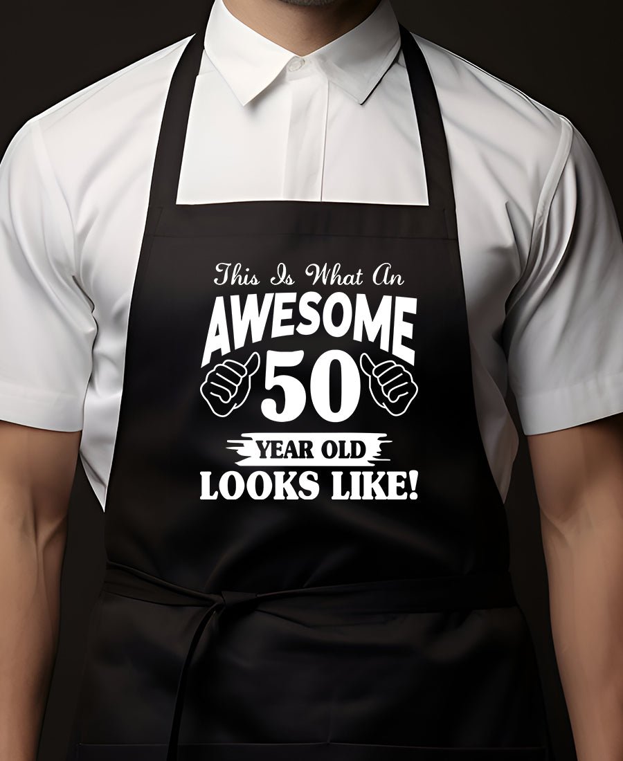 Met de opvallende opdruk "Awesome 50 Years Old" is dit schort niet alleen functioneel, maar ook een viering van levenservaring en wijsheid. Het is het ideale verjaardagscadeau voor die speciale man in je leven die zijn vijftigste mijlpaal bereikt. Of het nu gaat om een familielid, vriend of collega, dit schort straalt trots en vreugde uit voor degenen die de magische vijftig hebben bereikt.