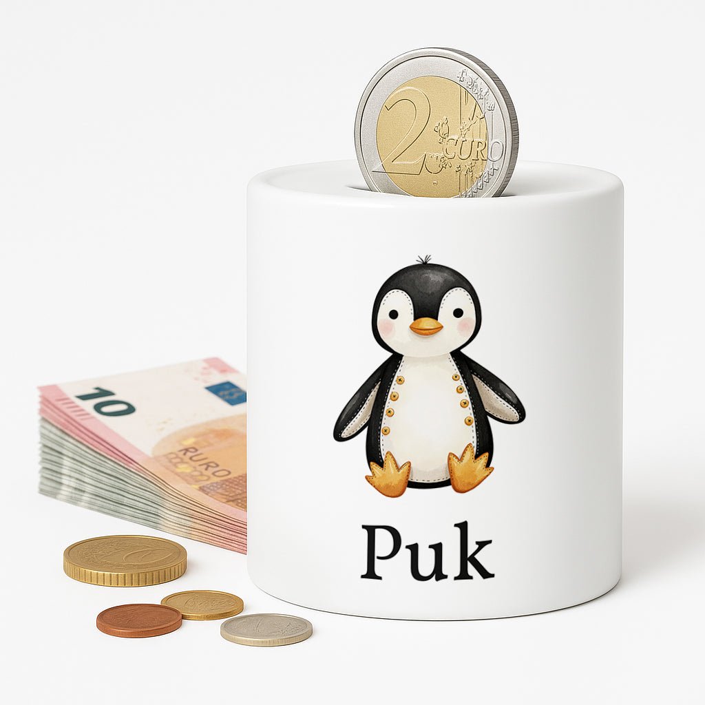 Deze lieve spaarpot met een vrolijke pinguïnillustratie is het perfecte cadeau voor baby’s, peuters en jonge kinderen. De spaarpot heeft de vorm van een mok en wordt gepersonaliseerd met een naam, waardoor het een uniek en waardevol aandenken wordt dat jarenlang meegaat.