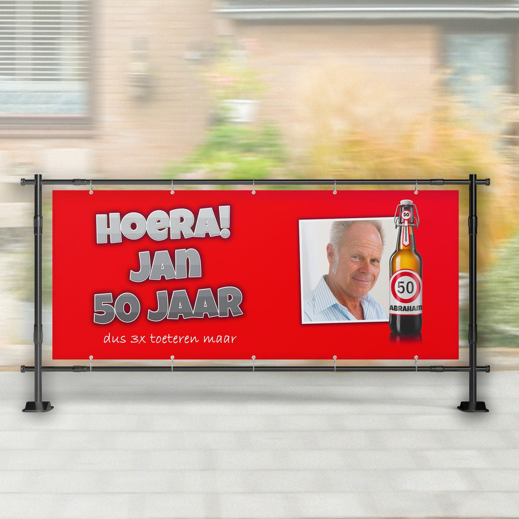 Hoera! 50 jaar! Abraham verassen met een persoonlijk spandoek? Dit spandoek is een leuk cadeau om te geven, en om te krijgen!