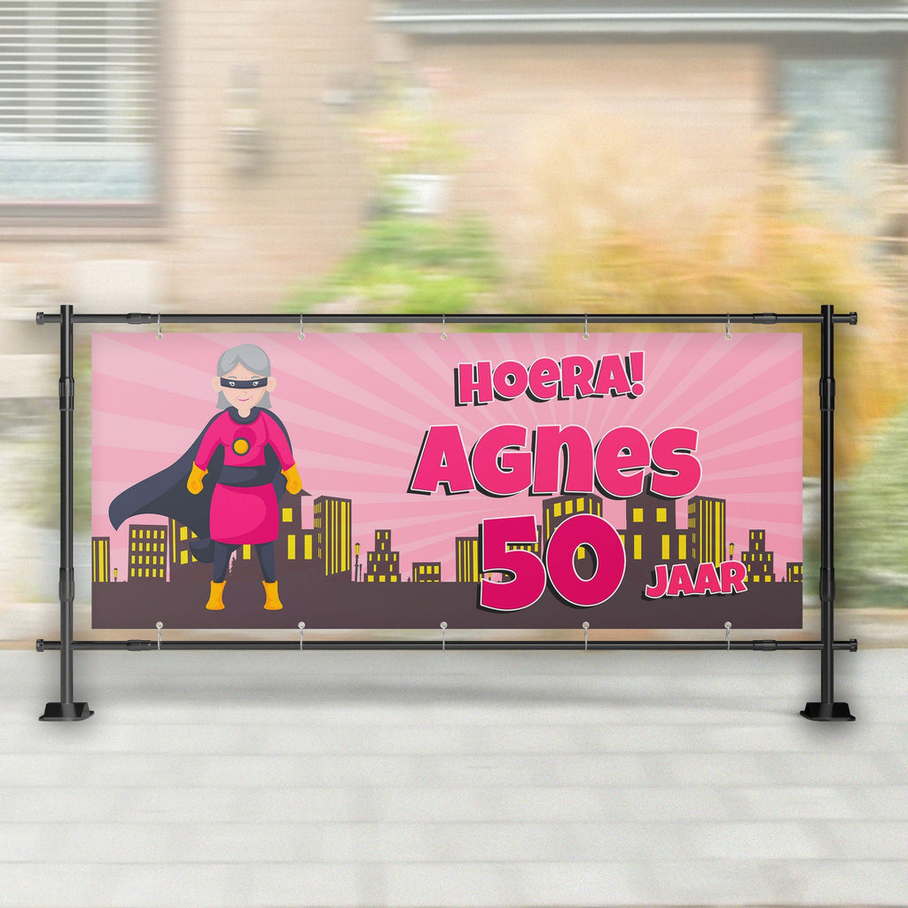 Maak je speciale momenten nog feestelijker met ons aanpasbare spandoek! Of het nu gaat om een Abraham, Sarah, verjaardag, geboorte of een andere gelegenheid, ons spandoek voegt een persoonlijk tintje toe aan elk feest.